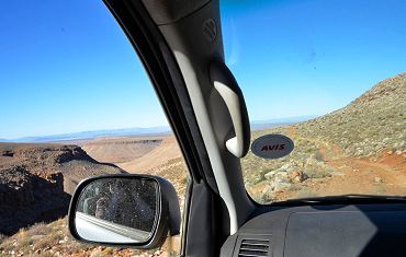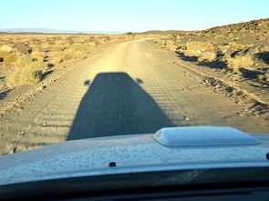 Also wieder zurück auf das Plateau, in der Hoffnung, wir hätten eine Abzweigung verpasst. Leider gab es mehrere und auch die nächste führte uns nur zu einem Gatter und einer Weide. Autos waren hier schon lange nicht mehr gefahren, auf dem blanken Stein bei tiefstehender Sonne konnte man die Fahrspuren kaum noch erkennen. Also wieder zurück zu dem Punkt, wo unser Navi uns nach rechts schicken wollte. Doch da war wirklich weit und breit kein Weg. Nochmal nach oben zu der Kreuzung. Auf dem letzten möglichen Weg, der eigentlich in eine falsche Richtung führte, entdeckten wir in der Ferne ein kleines Haus und beschlossen, nachzusehen, ob dort jemand lebt. Nachdem wir schon über eine Stunde durch Herumkurven verloren hatten war auf unserem Navi schon ein rechtes Wirrwar an zurückgelegten Wegen zu sehen. Dann fanden wir noch vor dem erwähnten Haus den richtigen Weg wieder. Hinter einem Hügel versteckt und für uns vom Hochplateau nicht zu sehen ging es hier endlich quer durch den Trockenfluss. Eng an einer Felswand vorbei führte die Straße auf der anderen Seite wieder hinauf auf die Ebene, nicht einsehbar von der anderen Seite. Unser Navi hatte uns schon richtig leiten wollen - nur kam die Anweisung zum rechts Abbiegen erst 150 Meter hinter der entscheidenden Kreuzung und hinter einer scharfen Rechtskurve. Das hatte uns in die Irre geführt.
