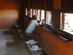Schilder verweisen auf die Einhaltung von Ruhe, der Bird Hide hat eine Tür und er wurde etwas unter Bodenniveau vor einem Wasserloch errichtet. Es gibt Bänke, von denen aus man die Vögel am Wasser beobachten kann, rundum stehen ein paar Bäume, die als Anflugstelle dienen. An der hinteren Wand informieren Schautafeln über die verschiedenen Vogelarten, die man in dieser Region finden kann.