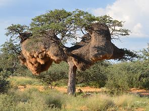 Es gibt einen Parkplatz direkt vor dem Zugang, von dem aus man auch einen Aussichtspunkt besuchen kann. Der Weg dorthin ist vom Camp aus gut beschildert. Ein schmaler, sandiger Weg führt noch etwa 40 Meter zum Hide und vorbei an einem riesigen Nest von Siedelwebern. Dort ist natürlich immer eine Menge los, zahlreiche Vögel fliegen ständig aus und ein. Der kleine Baum droht unter Last zusammen zu brechen.