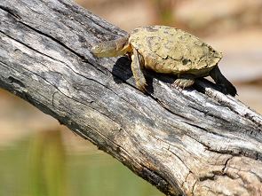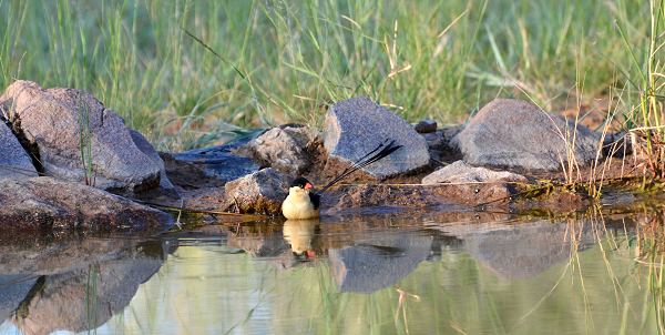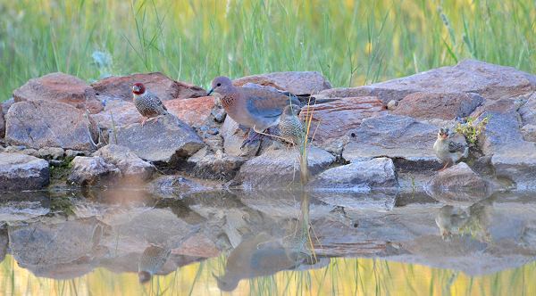 Wir konnten einige Vögel beobachten, meist waren es kleinere Arten wie Webervögel oder Finken, die hierher zum Trinken oder Baden kamen. Und natürlich auch die allgegenwärtigen Tauben. Auf dem Stamm in der Wassermitte sonnte sich am Morgen soger eine kleine Wasserschildkröte.