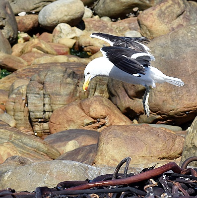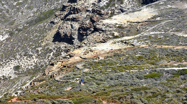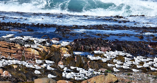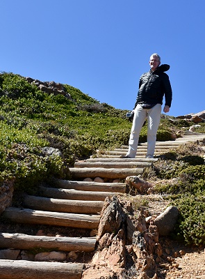 Über viele Stufen geht es hinauf auf die schon erwähnte Felsklippe direkt neben dem Parkplatz, es ist sehr heiß, schattenlos und der Wind hörte nicht auf. So wurde aus dem relativ kurzen Spaziergang eine sehr anstrengende Angelegenheit. Aber die Aussicht lohnt den Aufstieg und die Seevögel gleiten hier scheinbar schwerelos und ohne Probleme über den Köpfen der Wanderer im Wind.