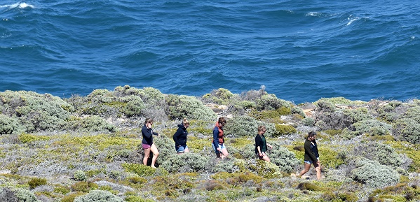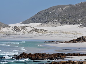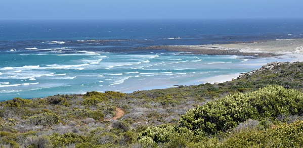 Nach dem Gipfel der ersten Klippe geht es direkt nochmals ein Stück höher. Der Wanderweg führt weiter über den Maclear Peak und danach oberhalb der Klippen entlang des schönen Diaz Beach. Schwimmen und Baden ist hier jedoch wegen der starken Strömungen sehr gefährlich! Zum Teil sind die Wege ab hier mit Brettern und Geländer angelegt, damit man nicht in Spalten stürzt oder diese weiträumig umgehen muss. Der Weg ist ein Teil des Good Hope Coastal Walk.
