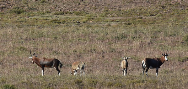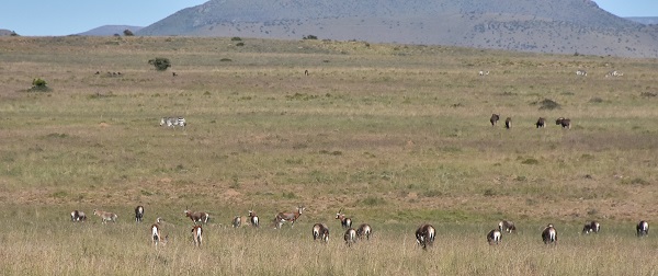 Auf der weiten und welligen Hochebene fanden wir dann noch Weißschwanz-Gnus, Bergriedböcke, Bunt- und Blessböcke, sehr viele Springböcke, Elen- und Kuhantilopen und die nie fehlenden Strauße. Auch auf kleinere Tiere wie Vögel und Schildkröten sollte man hier ebebfalls achten. Und Kap-Berzebras haben wir natürlich auch gesehen, auch mit Jungtieren. Gerade diese sind hier aber mit ihren Streifen am besten getarnt und auf weite Entfernung kaum zu erkennen.