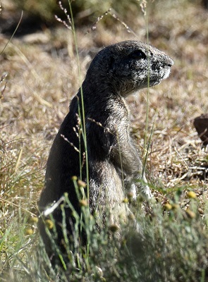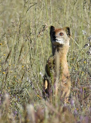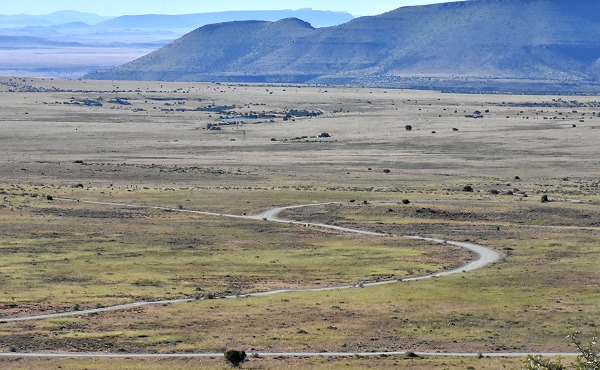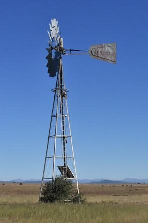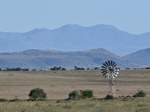 Das Wasserloch an der Ecke von Rooiplaat Loop und Link Road zieht natürlich immer Tiere an, hier trafen wir stets auf Herden von Gnus und Zebras. Markant steht hier ein Stück weiter ein Windrad in der Landschaft. Sie stammt noch aus der Zeit, als hier noch Framen betrieben wurden und wurde stehen gelassen, weil sie so typisch ist für die Karoo. Wenn der Wind 24-32km/Stunde wehte, dann wurden damit 700 Liter Wasser gefördert. Mittlerweile wird das nahe Wasserloch mit Hilfe einer Solarpumpe gespeist. Wer die Augen offen hält, der entdeckt hier auch kleinere Tiere wie Mungos, Kap-Borstenhörnchen oder Schildkröten, sie lassen sich im Gras in Nähe der Windmühle gut beobachten.