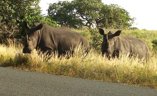 Hier auf der Seite seht ihr noch einmal die zwei Breitmaulnashörner, die 2004 vor unserem Auto die Straße überquerten, sowie einige Wasserböcke am Lake Bhangazi South und einen braunen Schlangenadler auf einem Strommast an der Straße nach St.Lucia.