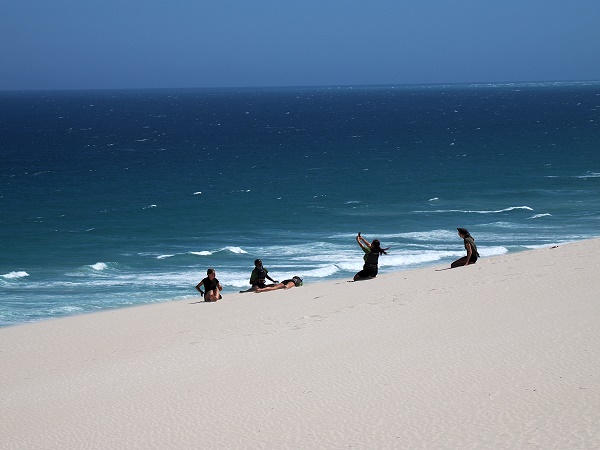 Möchte man eine Schleife fahren und biegt bei Pringle Bay auf die Nebenstraße in Richtung Cape Hangklip mit seinem Leuchtturm ab, so muss man den ganzen Weg leider wieder zurück. Die schneeweißse Düne wurde nämlich vom Seewind quer über die Straße geweht, sie ist hier durch den metertiefen weichen Sand versperrt. Einige Kapstädter betreiben hier an der steilen Düne auf der Bergseite aber den Trendsport Sandboarding und gleiten auf einer Art Snowboard den Hang aus pulverfeinen Sand hinab.