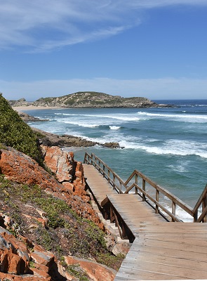 Die bis zu 148 Meter hohen Felsvorsprünge des Robberg Nature Reserve sieht man von fast überall in Plettenberg Bay. Die Halbinsel ist der beherrschende Abschlusss der großen Bucht nach rechts hin und schützt vor den kalten Südwinden. Schon von weitem leuchtet der bunte Sandstein und die hellen Sandhügel der Drift-Düne auf dem Kamm.