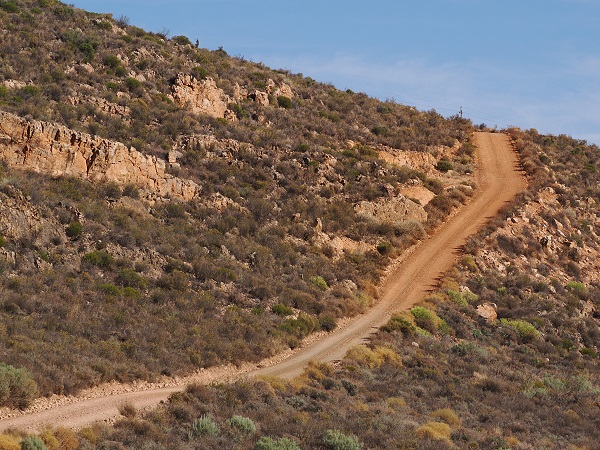 Oben angekommen führt die Straße dann durch eine schon hier wunderbare und sehr beeindruckende Felslandschaft mit Weiblick und bizarren Formationen zu beiden Seiten. Die Truitjieskraal Road ist Teil eines Fluchtwegs über die Kromrivier-Farm und den Kromrivier-Pass, wenn der Matjiesrivier Hochwasser führt und nicht passierbar ist. Die ziemlich holprige Schotterstraße, die nur eine Geschwindigkeit von etwa 20 km/h zulässt, ist 8,5 km lang und überwindet auf dieser Strecke 108 Höhenmeter, den Großteil davon auf den ersten zwei Kilometern.