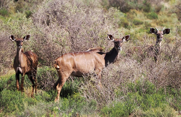 Neben den Rindern gibt es auch eine Menge Wildtiere zu entdecken, von denen wir sicher nur einen kleinen Teil gesehen haben. Kudus, Berg- und Vaal-Rehboks waren wohl schon immer hier unterwegs. Dazu kamen dann Weißschwanzgnus, Steppenzebras, Springböcke und Elenantilopen, die neu angesiedelt wurden. Raubtiere kamen nicht hinzu, so kann man heute hier problemlos wandern oder Mountainbike fahren.