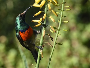 Der erste Anblick vom Haus ist schon überwältigend, denn davor befindet sich ein wunderbarer Garten mit diversen einheimischen Pflanzen. Sie ziehen mit ihren Blüten Insekten und Sunbirds an. Unterm Dach auf der Veranda nisteten Schwalben.