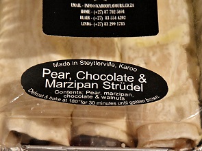 Leider erfuhren wir beim Bezahlen, dass am nächsten Tag geschlossen ist. Sonntags ist hier Ruhetag, bei den meisten anderen Restaurants ebenfalls. Sehr schade. Wir besuchten noch den angeschlossenen Delikatessenladen und kauften uns Sauce und Cordial von Brendas. Dabei entdeckten wir tiefgefrorene Pies und gerollte Pfannkuchen mit Birne, Schokolade und Marzipanfüllung, hergestellt von Hand im Ort Steytlerville von Karoo Flavours. Die haben wir dann mitgenommen, schließlich hatten wir hier ja eine voll ausgestattete Küche mit Backofen im Haus.