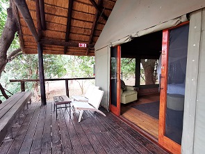 Wir bekamen das Zelt Nummer 13, das lag ca. 300 Meter Fußweg von der Rezeption entfernt. Der Blick auf den Fluss war von unserer Terrasse durch Grünzeug an einer Seite ein bisschen zugewachsen, was sich jedoch als Glück herausstellte. Unser Zelt war nämlich das einzige, dass komplett von großen umliegenden Bäumen beschattet wurde. Bei über 40°C Aussentemperatur zwar nur ein kleiner, aber vielleicht entscheidender Vorteil. Hier konnten wir uns rund um die Uhr auf die Veranda zurück ziehen und es uns dort bequem machen, in Ruhe lesen oder das Geschehen am Fluss beobachten. Was übrigens auch direkt aus den Betten heraus möglich ist.