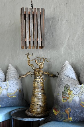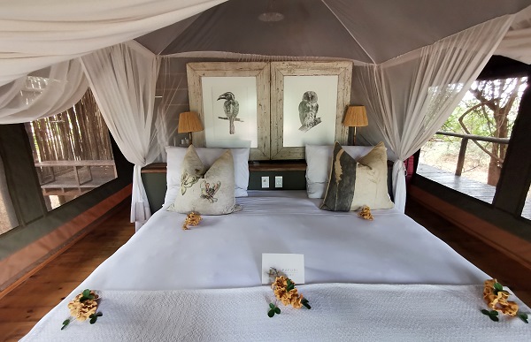Nach der Begrüssung mit Erfrischung zeigte man uns die Anlage. Es gibt einen offenen Rezeptionsbereich mit schön gestalteten Sofas und Sitzmöglichkeiten. Auch mit Blick auf den Fluss kann man sich hier auf bequemen Möbeln entspannen. Daneben befindet sich das Restaurant, in dem täglich vor dem Game Drive Snacks und nach der Rückkehr ein Frühstück serviert werden. Vor dem Game Drive am Nachmittag gibt es wieder Kaffee, Kuchen und Häppchen und am Abend trifft man sich dann zum Dinner.