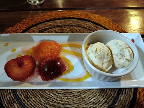 Am Morgen beim Frühstück wird das Tagesmenü vorgestellt. Man hat immer Auswahl für Vorspeise und Nachspeise zwischen zwei Gerichten, für den Hauptgang zwischen drei Gerichten, wovon eines vegetarisch ist, und dazwischen gibt es ein Sorbet als vierten Gang. Damit die Küche eine Übersicht hat, wählt man am Morgen aus, was man am Abend essen möchte. Die Portionen sind recht üppig, vor allem bei der Hitze. Am den letzten Tagen haben wir die Vorspeise weggelassen und zum Nachtisch nur Eis mit Amamrula bestellt.
