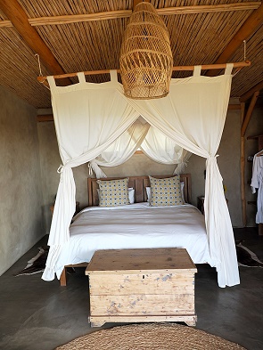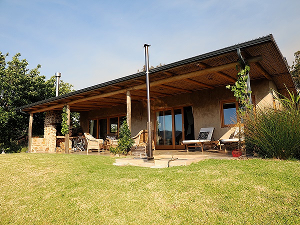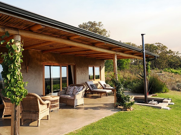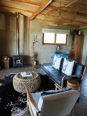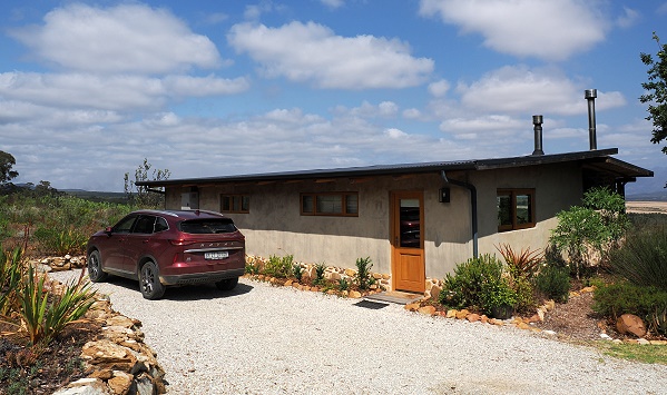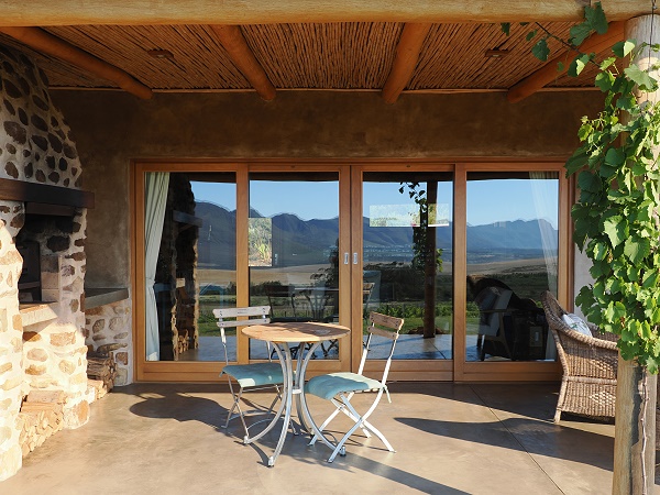 Das Haus ist handgefertigt mit lokalen Naturmaterialien wie Holz, Lehm und Stroh, was für eine warme, organische Atmosphäre sorgt. Die offene Küche ist hübsch, es gibt einen Esstisch und gemütliche Sofas. Die großen Schiebetüren vor Wohn- und Schlafzimmer können leicht geöffnet werden und bieten einen schönen Weitblick in die Umgebung auf die Walker Bay und die Kleinriviersberge. Eine solche hochwertige Qualität an Schiebetüren wie hier hatten wir bislang in Südafrika noch nicht gesehen.