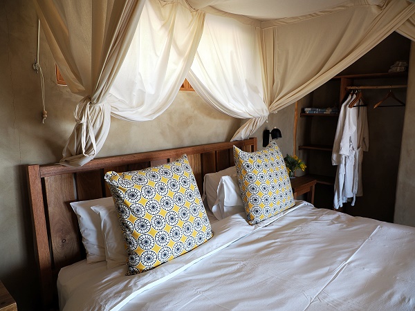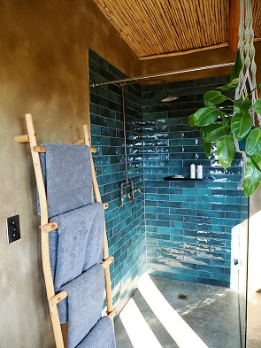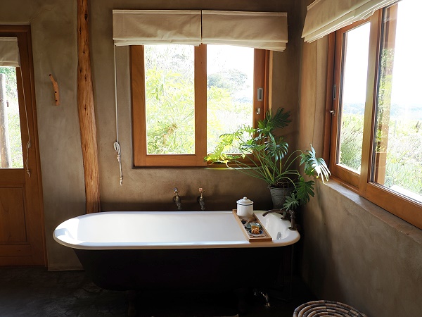 Das Bad hat eine Badewanne und eine mit Glaswand abgetrennte Dusche. Eine weitere findet man im Außenbereich, zu dem eine eigene Tür führt. Hier duscht man mit Blick auf den Fynbos Garten mit blühender Protea. Nette Kleinigkeiten findet man hier, wie eine Kennzeichnung für heiß und kalt in Form von kleinen Kacheln an den Amaturen und einen schönem Waschtisch. Ein Föhn fehlt allerdings, da Solar Power.