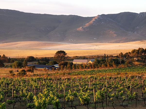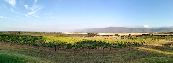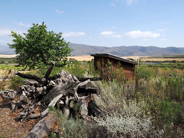 Nach einer langen Anfahrt von Wilderness mit einem Besuch in De Hoop kamen wir um 17:00 Uhr auf der Farm an und wurden freundlich begrüßt und weiter zum Cottage geschickt. Auf dem Hof wurde gerde ein neues kleines Holzhaus errichtet, in dem man einen Farmshop einrichten wird. Vorbei an Ziegen, Kühen, Fynbos und Weinreben fuhren wir ein Stück bergauf zum Cottage an der Grundstücksgrenze. Es gibt sogar eine eigene Zufahrt von oberhalb mit Tor und Code, so dass man nicht über die Farm fahren muss.