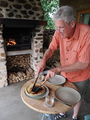 Wir versuchten ihn auf dem Grill zu garen. Von außen sah das zuerst prima aus, aber als wir dann hungrig anschnitten war der Teig innen noch fast roh und es schmeckte nicht. Zum größten Teil ein Fall für den Eimer der Mülltrennung, der an das lokale Schwein namens Fuzzi verfüttert wurde. Wir mussten dann Butterbrote essen, ein leckerer Blanc de Noir von Rainbow´s End war danach Trost genug.