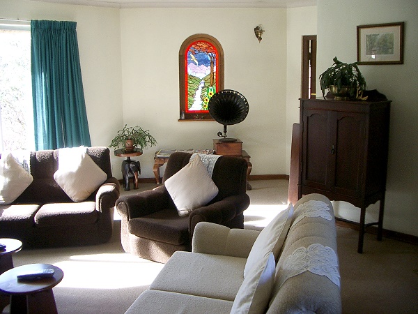 Die Einfahrt ist sehr schmal, ebenso die Durchfahrt durch den Garten zu den Zimmern. Man parkt direkt vor der Tür, hinter den Gebäuden befindet sich ein stark abfallendes Gelände mit Rasen und bunten Blumen, das direkt zum Wald und zum Fluss Lions River führt. Dieser hat ein kleines Wehr und führte bei unserem Herbstbesuch relativ wenig Wasser. Im Sommer, wenn es stark geregnet hat, kann man sich mit hauseigenen Gummireifen den Fluss heruntertreiben lassen.