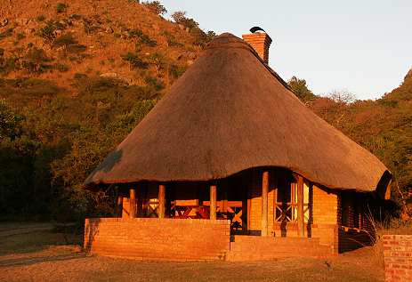 Die 39 ausgesprochen hübschen Zwei-, Vier-, oder Sechsbett-Chalets des Ntshondwe Camp liegen idyllisch und versteckt an einem grünen Berghang, mit den beeindruckenden Felsformationen des Ngoje-Plateaus als malerischen Hintergrund. Bei Sonnenuntergang leuchten die Felskanten in warmen Rottönen.