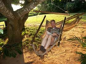 Rundum ist man von hohen Bäumen umgeben, in denen reges Vogel- und Affenleben herrscht. Am Morgen braucht man keinen Wecker mehr, wenn eine Horde grüner Meerkatzen über das Blechdach getobt ist. Nur einen Kingfisher haben wir hier leider nicht gesehen...