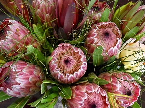 In der Mitte des Eingangsbereichs steht die Kasse, hier kann man auch Wein und einige Leckereien kaufen. Vor der gemütlichen Sitzecke am Eingang standen Vasen mit prächtigen Proteen. Das Bistro hatte leider gerade geschlossen, weil man um 14:00 Uhr einen Harley Club erwartete. Leider war die Wartezeit zu lang, die Harleys hätte ich auch gerne noch gesehen.