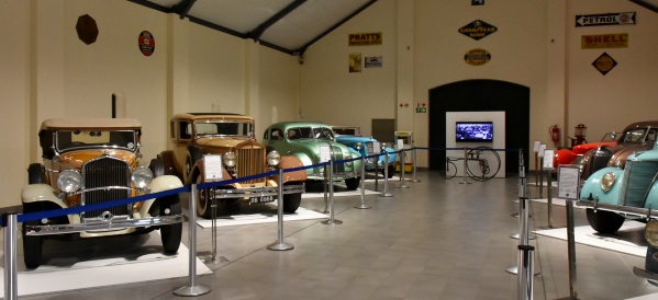 Dann betritt man den Innenhof, um den sich vier Gebäude gruppieren, die wie frisch renovierte Scheunen aussehen. etwa 80 Fahrzeuge waren bei unserem Besuch hier zu besichtigen, ausgestellt in vier entfeuchteten Hallen auf einer Fläche von 2.700 m². In Museumsbesitz befinden sich aber über 220 Fahrzeuge und fast alle sind fahrbereit. Kein Wunder, sie werden auch einmal im Monat bewegt, zwischen den Hallen gibt es einen kleinen ovalen Rundkurs.