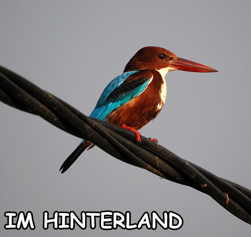 Der Braunliest, auch White-throated Kingfisher genannt, ist ein überall vertretener, auffälliger Vogel. Mit seinem schokobraunen Gefieder und den leuchtend türkisblauen Flügeln ist er oft auf Stromleitungen oder Zaunpfählen zu finden, von wo aus er nicht nur Fische, sondern auch Insekten im Feld erspäht.