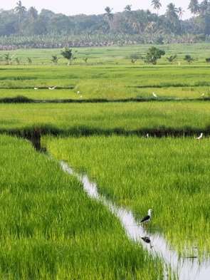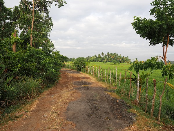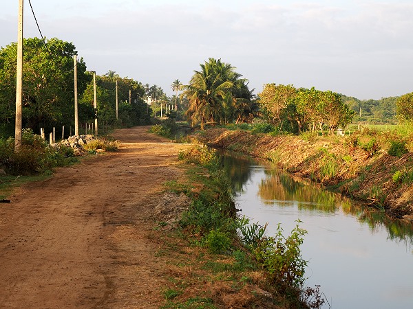 Ein Spaziergang durch das Hinterland der srilankischen Südküste führt uns in eine Welt, in der das tiefe Grün der Reisfelder fließend in das stille Wasser der verzweigten Kanalsysteme übergeht. Bauern arbeiten auf den Feldern, sie kommen meist mit dem Fahrrad oder Motorrad hierher. Während sie auf den schmalen Pfaden zwischen den Parzellen wandern, blieben wir auf dem Hauptweg, der erst ein Stück der Küstenlinie folgt und dann ins Landesinnere schwenkt. Viel Verkehr herrscht hier nicht, da die Straße kaum für Autos geeignet ist, weshalb hier meist nur Motorräder oder Tuk-Tuks unterwegs sind.