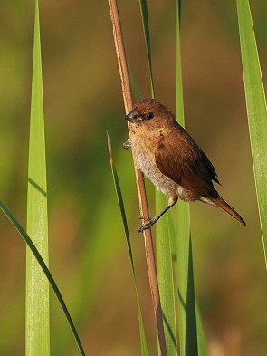 Inmitten der Reisfelder bewegen sich zahlreiche kleine Körnerfresser, die in Schwärmen durch das reifende Getreide ziehen. Mit etwas Geduld lassen sie sich auf den Zäunen und Büschen am Feldrand nieder, so dass wir sie dort gut fotografieren konnten.