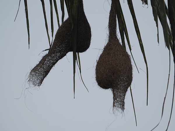 In den ufernahen Bäumen und Schilfgürteln entdecken wir die kunstvollen Bauten der Webervögel. Ihre hängenden Nester, die wie filigrane, aus Gras gewobene Körbe an den Zweigen baumeln, zeugen von einer architektonischen Meisterleistung der kleinen Bewohner. Leider waren sie zu dieser Jahreszeit verlassen, da gerade keine Brutzeit war.
