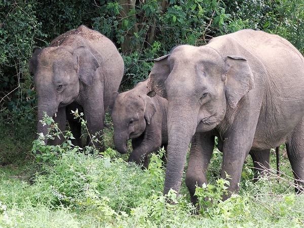 Nachdem wir das Nationalpark-Tor hinter uns gelassen hatten, war die Safari jedoch noch nicht zu Ende. Da es bereits zu dämmern begann, begegneten wir auf der öffentlichen Straße (B35) zwischen Buttala und Kataragama weiteren Elefanten, die sich im schwindenden Licht das Asphaltband als bequemen Weg ausgesucht hatten.