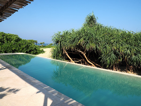 Der Infinity-Pool im Elements Beach & Nature Resort wurde so gestaltet, dass er sich harmonisch in die naturbelassene Umgebung zwischen Strand und Lagune einfügt. Er liegt leicht erhöht inmitten eines Palmengartens. Es stehen einige Liegen zur Verfügung, die bei unserem Aufenthalt aber tagsüber mit Handtüchern belegt waren. Liegen konnten wir hier nicht, denn das locker Knüppeldach darüber spendete nicht genug Schatten, wenn die tropische Sonne am Nachmittag zu intensiv wird. Wir waren meist am frühen Morgen oder am Abend schwimmen, da hatten wir den Pool für uns alleine.