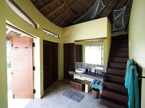 Im Zentrum steht ein großzügiges Doppelbett, das mit einem schönen Moskitonetz rundum ausgestattet ist. Das braucht man auch, denn die Lüftungsöffnungen rundum haben zwar ein grobes Netz gegen Vögel und Kleintiere, für Mücken ist das aber kein Hinderniss. Die Bettwäsche besteht aus feiner Baumwolle, um den tropischen Temperaturen gerecht zu werden. Zwei weitere Betten befinden sich oben auf einer Empore für mitreisende Kinder. Statt Plastikflaschen findet man im Zimmer meist wiederauffüllbare Glasflaschen.