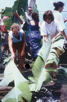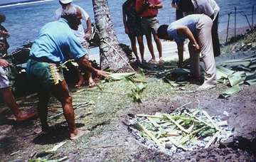 Nachdem nun alle Vorbereitungen abgeschlossen sind wird die Erdkuhle mit Bananenblättern ausgelegt. Darauf kommen dann die Hühnerpakete, Süßkartoffeln, Gemüse, Fisch und andere leckere Sachen. Nochmals eine Lage Bananenblätter, dann wird die gefüllte Erdsenke zugeschaufelt, damit die Hitze im Boden das Essen garen kann. Das dauert einige Stunden. In der Zwischenzeit gibt es Erfrischungen und man kann etwas ruhen.