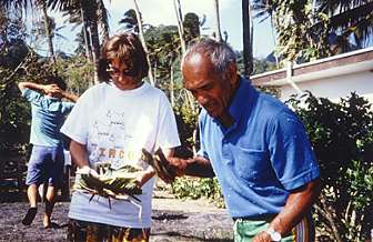 Am Sonntag veranstaltet Piri in seinem Garten ein Umukai-Picknik. Das ist eine Art Barbequeue ohne Grill: in einer Erdsenke wird erst ein Feuer entfacht und danach in Blätter eingewickelte Speisen in dem heißen Loch verbuddelt, um in der Restwärme gegart zu werden. Das Verfahren ähnelt dem Vorgehen bei einem hawaiianischen Luau.