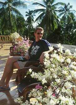 Michael entspannt im Blütennmeer auf der Terrasse vor der Lobby.