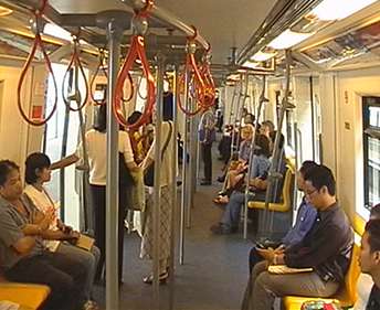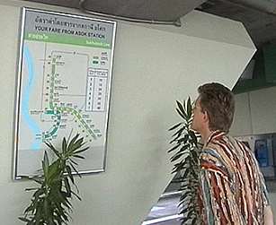 Meist sind die Wagen allerdings nur locker gefüllt, die Bevölkerung von Bangkok scheint das neue Transportsystem noch nicht voll in ihren Alltag integriert zu haben. Auf meinem Bild links ist es schon gut besetzt, allerdings war das nicht zur Rush Hour. Vielleicht sind Fahrpreise von 10-40 Baht für die meisten zu teuer, der ursprünglich geplante Einheitspreis von 15 Baht ließ sich auf Grund der explodierten Kosten nicht verwirklichen. Für 10 Baht kann man schon über eine Stunde bis zur Endhaltestelle mit den Expressbooten auf dem Chao Phraya fahren. Wenn die Straßen nicht verstopft sind, dann haben Personengruppen unter Umständen sogar einen Preisvorteil, wenn sie zusammen ein Taxi nehmen. Im Skytrain wird ja immer pro Person bezahlt und Taximeter machen das Taxi in Bangkok relativ preiswert.