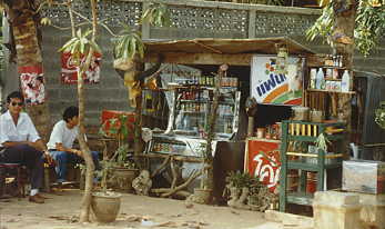 Direkt am Eingang dieser Tempelanlage liegt der nach einem Brand in den 60er Jahren wieder aufgebaute Tempel Vihara Phra Mongkol Bophit. Darin sieht man einen 12 m hohen sitzenden Buddha aus dem 15. Jahrhundert. Dieser Tempel mit seinem großen Parkplatz und zahlreichen Souvenirläden ist Ausgangspunkt vieler Touren durch Ayutthaya. Auf dem Bild ist ein typisch thailändischer Kiosk zu sehen, 1991 auf dem Parkplatz fotografiert. 1998 habe ich ihn nicht mehr gefunden....